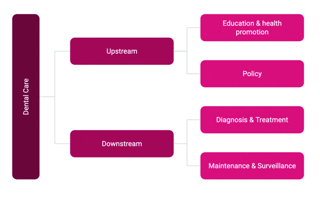 CDCP’s impact on the oral health of Canadians is undeniable; however, dental care is multifaceted. It involves prevention, diagnosis, treatment, and ongoing maintenance. The CDCP is improving access to prevention mainly through cleanings, polishing, and fluoride treatments; diagnosis through radiographic and clinical assessments; and treatment through coverage of a broad range of procedures. Its impact on long-term ongoing maintenance is still unknown as individual eligibility changes every year, and the program is only in its early years. At this time, the CDCP program is impacting Canadians’ oral health downstream, but an upstream gap still exists in patient education and health promotion (Fig. 1).